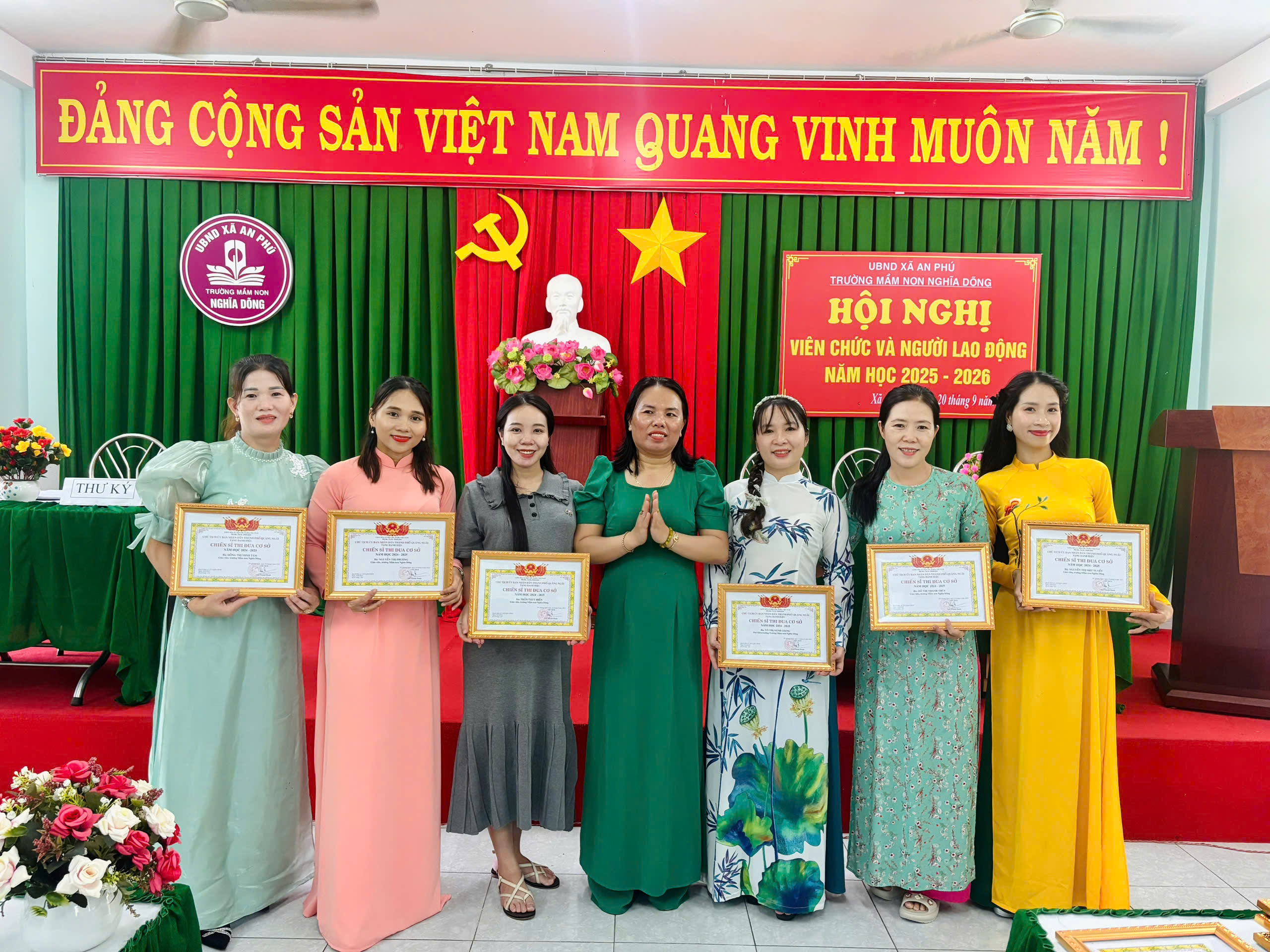 Đồng thời thống nhất mục tiêu, phương hướng nhiệm vụ năm học 2025-2026; chú trọng thực hiện chủ đề năm học của ngành Giáo dục: “Kỷ cương – Sáng tạo – Đột phá – Phát triển” và chủ đề giáo dục mầm non: “Xây dựng trường học hạnh phúc, Cô giáo như Mẹ hiền”.